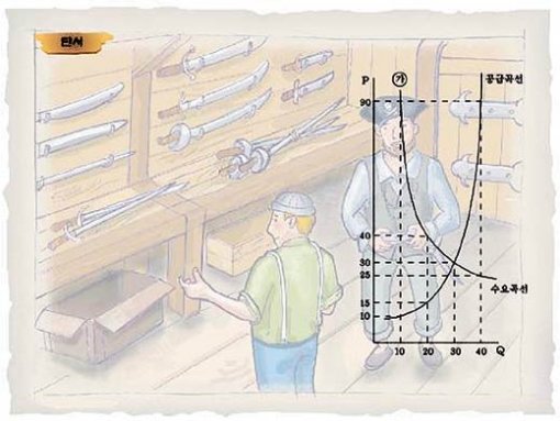 해적칼을 살 때의 지불하고자 하는 금화의 개수(가격 P)와 사고자 하는 해적칼의 개수(수요량 Q)와의 관계를 나타낸 그래프(수요곡선)는 ㉮ 그래프와 같다. 그래프를 보고 오른쪽 표의 빈 칸을 채우고 이 섬의 주민들이 몇 개의 칼을 만들고 살 것인지 그 이유를 대장장이에게 설명하라. 또, 40개의 칼을 만든다면 어떤 일이 벌어지는지도 설명하면 C섬으로 가는 길을 일러 주리라.