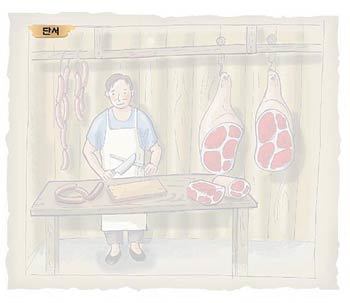 (2) 판매 가격을 기준으로 최소한 들어가야 할 돈을 배분하여 삼겹살 40kg의 원가를 구하여라. 원가를 구하는 방식을 정육점 주인에게 설명해 주면 원가로 식량을 구입할 수 있다. 원가로 구입한 식량을 가지고 E섬으로 가라.