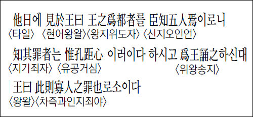 見於王은 왕에게 謁見(알현)했다는 말이다. 맹자는 왕의 신하가 아니어서 알현한다고는 하지 않는데, 이 장에서만은 見을 알현의 ‘현’으로 읽는다. 爲都의 爲는 治(치)와 같다. 都는 先君(선군·돌아가신 군주)의 사당이 있는 큰 도시를 말한다. 臣은 맹자가 군주에 대해 스스로를 일컬은 말이다. 爲王誦之는 왕을 위해 외워준다는 말이다. 爲∼는 ‘∼을 위해서’다. 之는 앞서 공거심과 대화한 내용이다. 此는 백성들이 餓死하고 離散하는 등 정치가 제대로 이루어지지 않음을 가리킨다.