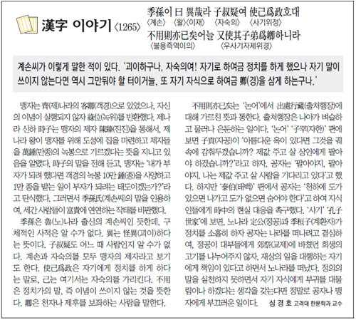 不用則亦已矣는 ‘논어’에서 出處行藏(출처행장)에 대해 가르친 뜻과 통한다. 출처행장은 나아가 벼슬하고 물러나 은둔하는 일이다. ‘논어’ ‘子罕(자한)’ 편에 보면 子貢(자공)이 ‘아름다운 옥이 있다면 그것을 궤 속에 감춰두겠습니까? 제값 주고 살 상인에게 팔아야 하겠습니까?’라고 하자, 공자는 ‘팔아야지, 팔아야지. 나는 제값 주고 살 사람을 기다리고 있다’고 했다. 하지만 ‘泰伯(태백)’ 편에서 공자는 ‘천하에 도가 있으면 나가고 도가 없으면 숨어야 한다’고 하여 지식인들에게 時中의 현실 대응을 촉구했다. ‘사기’ ‘孔子世家’에 보면, 노나라 定公(정공)과 季桓子(계환자)가 정치를 소홀히 하자 공자는 나라를 떠나려고 결심하여, 정공이 대부들에게 郊祭(교제)에 바쳤던 희생의 고기를 나누어주지 않자, 재상의 일을 대행하는 자기에게 책임이 있다고 하면서 노나라를 떠났다. 정의의 말을 실천하지 못하면서 자기 자식에게 부귀를 대물림이나 하겠다는 생각을 갖는다면 정말로 공자나 맹자에게 부끄러운 일이다.