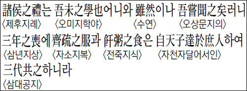吾未之學也에서 之는 앞의 ‘제후의 예’를 가리킨다. 짧은 부정문에서 목적어가 대명사이기 때문에 동사 앞으로 도치된 것이다. 吾嘗聞之矣의 之는 아래의 말들을 가리킨다. 三年之喪은 부모의 상을 말한다. ‘논어’ ‘陽貨(양화)’편에 나오는 공자의 말에 따르면, 부모의 상을 삼년 기한으로 하는 것은 태어나 삼년간 부모의 품에서 보호받은 것을 보답하려고 그 햇수만큼 상복을 입는 것이라고 한다. 삼년상은 실제로는 25개월을 기한으로 한다. 27개월이라는 설도 있다. 齊疏(자소)는 거친 베의 상복이다. 齊(자)는 齊衰(자최)의 준말이고, 衰는 최(최)와 통한다. 본래 삼년상에는 아랫단을 꿰매지 않은 斬衰(참최)의 상복을 입는다. 齊衰는 아랫단을 꿰맨 상복으로 일년상에 입지만, 상복 전체를 대표할 수도 있다. 여기서는 상복 전체를 가리키는 말이되, 실제로는 참최의 상복을 가리킨다. 전(전)은 짙은 죽인 미음, 粥(죽)은 옅은 죽이다. 상례에 따르면 부모가 돌아가신 후 사흘이 되어야 죽을 먹고 장례를 치른 후 疏食(소사·거친 음식)를 든다고 했다. 自天子達於庶人은 ‘천자로부터 서민에 이르기까지’로, 自∼은 ‘∼로부터’의 뜻을 나타낸다. 三代는 夏(하)·殷(은)·周(주) 나라를 가리킨다.