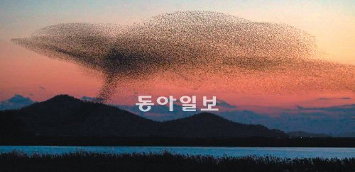 가창오리 군무 장관 전남 해남군 고천암호에서 찍은 가창오리 군무 장면, 해질녘 수십만 마리가 한꺼번에 떠올라 비상하면서 마치 거대한 고래 또는 새 형상을 빚어내는 자연의 신비를 순간 포착했다. 오영상 씨 제공