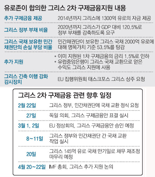 유로존(유로화 사용 17개국)이 그리스에 대한 2차 구제금융 지원방안을 최종 합의해 글로벌 금융시장이 고비 하나를 넘어섰다. 하지만 추가 구제금융에 회의적인 유로존 국가의 의회 승인 절차와 그리스의 긴축안 이행 여부가 남아있어 안심하기에는 이르다는 지적이 많다.