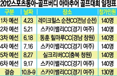 ‘2012 스포츠동아-골프버디 아마추어 골프대회’가 23일 레이크힐스 순천 골프장에서 예선 1차전이 열린다. 6차례 예선전을 거친 뒤 10월에 결승이 열린다. 스포츠동아DB