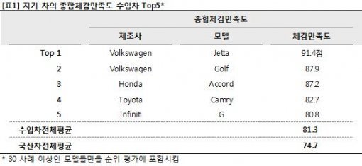 15일 자동차전문 리서치업체 마케팅인사이트는 ‘수입차 종합체감만족도’에 대한 설문조사 결과를 발표하며 이같이 밝혔다. 폴크스바겐은 ‘제타’와 함께 ‘골프’가 2위에 오르는 등 상위권을 휩쓸었다.