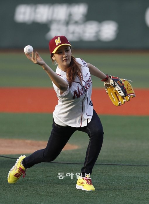 18일 오후 목동 야구장에서 열린 프로야구 넥센-삼성 경기에 앞서 걸그룹 스피카 박주현이 시구를 하고 있다.