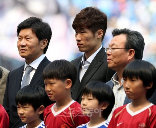 20일 오후 수원월드컵경기장에서 열린 2012 K-리그 수원삼성과 울산현대 프로축구 경기에 맨체스터 유나이티드 박지성이 빅버드를 찾아 정몽규 축구연맹 총재와 함께 유소년들과 기념 촬영을 하고 있다.