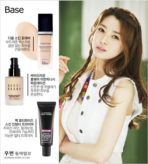 올해 가장 주목 받는 신인 걸그룹 ‘헬로비너스’. 차세대 한류 아이돌로 기대를 모으며 인기몰이에 나섰다. 그녀들의 발랄한 매력이 돋보이는 메이크업 노하우를 배진아(라륀느 부원장)씨가 공개한다. 헬로비너스 나라의 ‘인형 메이크업’ 포인트! 눈매와 입술을 또렷하게 연출해 답답함을 피한다. 이목구비가 또렷할 경우 모든 부분이 강조되면 자칫 역효과가 날 수 있으므로 한 두군데 정도만 포인트를 살린다. BASE 프라이머로 피부톤을 깨끗하게 정돈한다. 파운데이션 2종을 믹스해 브러시로 얇고 고르게 바른다. 다크써클은 컨실러로 꼼꼼히 커버해 그늘진 곳을 없앤다.