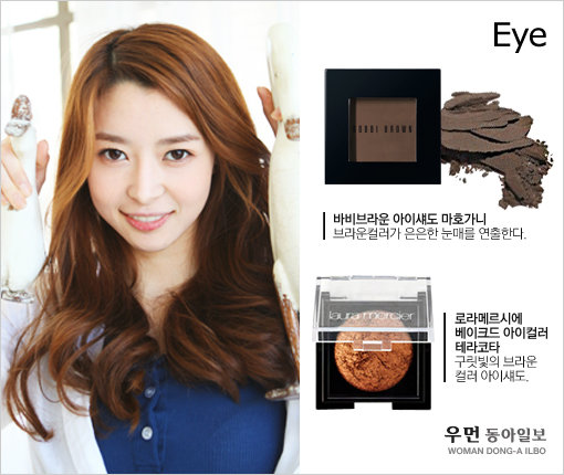 EYE 아이 프라이머를 바른 후, 베이지 섀도로 붉은기를 없앤다. 브라운 컬러 섀도로 자연스러운 음영을 부여한 뒤, 골드빛 펄 섀도를 언더라인에 발라준다. 블랙 아이라이너로 속눈썹 점막을 꼼꼼히 채워 인형처럼 또렷한 눈매를 연출한다.