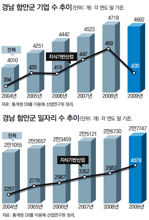 삼성, 현대자동차, LG와 같은 대기업이 없는 곳에서도 일자리가 늘어날 수 있을까. 경남 함안군은 이런 물음에 대해 긍정적인 답변을 제시한다. 함안군에서는 2004년 말부터 5년 동안 6600여 개의 일자리가 새로 생겨났다. 이 가운데 1800여 개가 지식기반기업에서 나온 것이다. 전체 일자리 증가율은 연평균 5.7%였지만 지식기반기업 일자리는 12.6%씩 늘어났다.