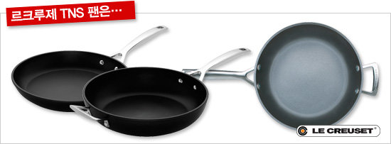 르크루제 TNS 팬은… 강화 알루미늄, 스테인리스 스틸, 눌러붙지 않는 논스틱 코틱으로 구성된 통 3중 구조의 팬.부드러운 소재의 조리도구를 사용하면 반영구적인 사용이 가능하다. 뛰어난 열전도, 열보유 &균일한 열분배로 저수분 혹은 저유분의 은근한 요리를 쉽게 할 수 있다.