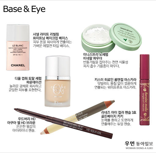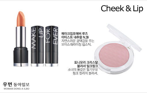 BASE 화사한 피부 표현이 포인트. 우선 미세한 펄이 있는 핑크빛 베이스를 발라준다. 여기에 파운데이션을 고르게 펴 바르고 미네랄이 함유된 파우더를 T존과 애플존에 살짝 발라 은은하게 빛나는 피부를 연출해준다. 이때 넓은 브러쉬를 사용해 가볍게 터치해주면 자연스러우면서 은은한 윤기를 연출할 수 있다. 마지막으로 촉촉함을 극대화하기 위해 미스트를 얼굴 전체적으로 고르게 뿌려 마무리.