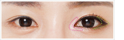 한톤 밝은 펄 섀도를 앞머리에 발라 앞트임 효과를 준다.