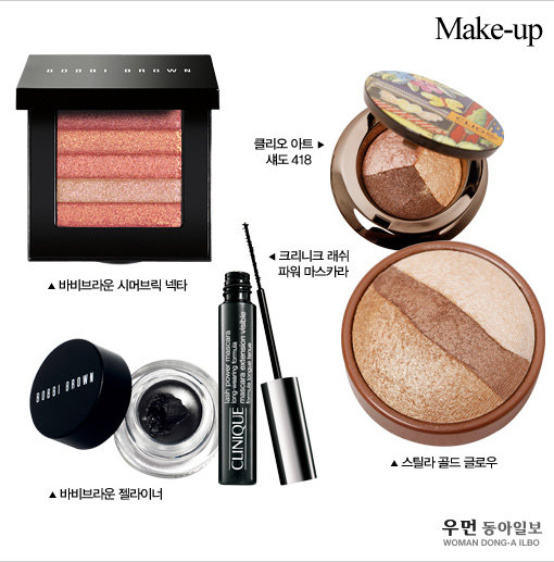 골드톤 섀도로 눈두덩 전체를 바르고, 언더라인의 눈 앞머리에서 꼬리까지 발라 애교살을 만들어준다.