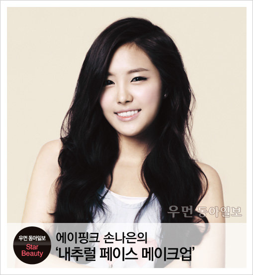 소녀다운 순수함으로 인기몰이 중인 걸그룹 에이핑크. 내추럴한 매력을 강조한 에이핑크 손나은의 메이크업 노하우를 그녀의 메이크업 아티스트 박세나(강호 더 레드카펫)씨가 공개한다. 에이핑크 손나은의 ‘내추럴 페이스 메이크업’ 포인트! 기초, 베이스 모두 수분 라인의 제품을 사용, 촉촉함을 부여하고 파운데이션의 밀착력을 높여 얇지만 완벽한 피부 표현이 중점을 두었다. 베이스 기초 단계에서 충분한 수분감을 주기 위해 수분 위주의 기초 제품을 꼼꼼하게 발라 피부결을 정돈, 파운데이션의 밀착을 도와준다. 약간 노란빛이 도는 피부로 피부톤을 환하게 연출하기 위해 핑크빛이 감도는 파운데이션을 이용해 자연스러운 피부톤으로 완성한다,