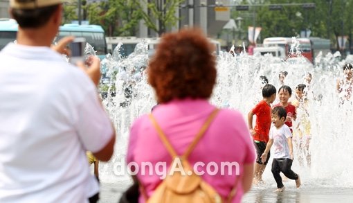서울 낮 기온이 31도 까지 오른 20일 오후 서울 광화문광장 분수대에서 한 어린이가 더위를 식히고 있다.