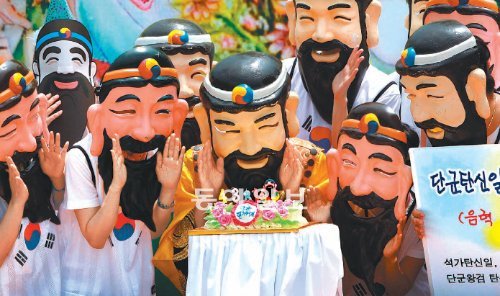 제4381번째 단군왕검 탄신일(음력 5월 2일)인 21일을 맞아 서울시청 앞 서울광장에서 국학원청년단원들이 단군왕검 가면을 쓰고 생일 축하 퍼포먼스를 벌이고 있다. 국학원청년단은 국학원의 산하 단체로 2003년 12월 중국의 고구려 역사 왜곡을 막기 위해 생겨났다.