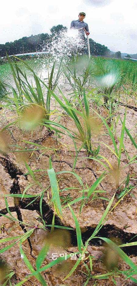 중부권에 최악의 가뭄 피해가 이어지고 있는 24일 경기 화성시 비봉면 남전리 일대 논에 육군 51사단 화생방지원대 장병들이 농업용수를 공급하고 있다.