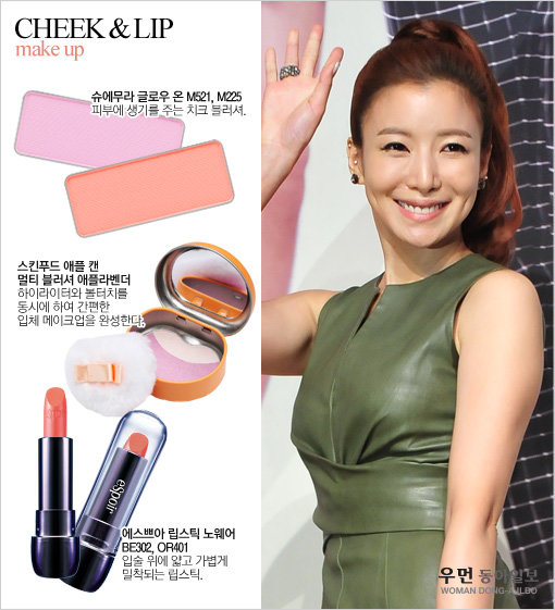 SBS 드라마 ‘신사의 품격’의 제작 발표회에 등장한 윤세아. 섹시한 느낌의 포니테일에 어울리는 세련된 아이 메이크업으로 시선을 끌었다. 눈꼬리를 살짝 빼내어 완성한 또렷한 눈매 연출이 포인트인 ‘시크 아이 메이크업’의 노하우를 그녀의 메이크업 아티스트 수이(보보리스 원장)에게 들었다. 윤세아의 ‘시크 아이 메이크업’ 포인트! 라인을 섀도와 그라데이션해 그윽하면서도 또렷한 눈매를 완성한다. 이때 눈꼬리 부분은 뭉툭하게 끝내지 않고 사선으로 빼내 그려 세련되고 도시적인 이미지로 연출한다. BASE 탄력있는 찰진 피부 표현을 위해 쫀쫀한 크림 파운데이션을 사용한다. 파우더링을 하기 전에 크림 블러셔를 이용해 피부 속에서 배어나오는 듯한 자연스러운 홍조를 만들어 준다.