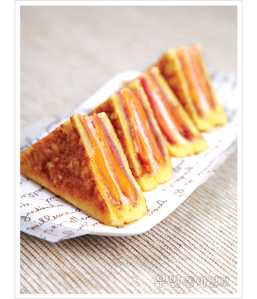 요리하기 1. 식빵은 가장자리를 자른다. 2. 식빵의 한쪽 면에 딸기잼을 바르고 그 위에 햄, 치즈, 햄 순으로 올린 다음 식빵으로 덮는다. 3. 그 위에 다시 햄, 치즈, 햄 순으로 올린 다음 딸기잼 바른 식빵으로 덮는다. 4. 달걀에 소금을 넣어 풀고 샌드위치를 담가 모든 면에 달걀물을 골고루 입힌다. 5. 달군 팬에 식용유를 두르고 샌드위치를 노릇하게 굽는다. TIP·중간 불에서 앞뒤로 노릇하게 구운 후 샌드위치를 세워 옆면도 골고루 구우세요. 6. 샌드위치가 살짝 식으면 대각선으로 자른다. TIP·너무 뜨거울 때 자르면 치즈가 흘러내려 샌드위치가 지저분해 보여요. 정리·김수연<우먼 동아일보 http://thewoman.donga.com 인턴 에디터 yoni0622@gmail.com> 요리·램블부부 도움주신 곳·나무 수 02-3012-0117 맞벌이 부부를 위한 쉽고 빠른 저녁 밥상 ‘퇴근 후 30분 요리’는…