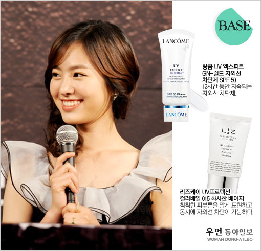 선크림이 피부에 자연스럽게 스며들면 피부톤을 보정할 수 있는 화사한 컬러의 자외선 차단 제품을 한 겹 더 발라준다. 피부가 그을리는 것을 막아주고 피부톤도 한결 화사하게 표현할 수 있다.