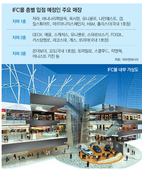 IFC몰은 서울의 금융 중심지 여의도에서 최초로 문을 여는 쇼핑몰이다. 총면적 8만9000m², 지하 1∼3층 규모의 쇼핑몰엔 각종 제조유통일괄형(SPA·기획 디자인 판매를 제조회사에서 맡는 의류점) 브랜드와 CGV, 영풍문고, 식당가 등 약 110개의 매장이 들어선다. IFC몰 지상에는 딜로이트와 필립모리스, 소니 등이 입주한 오피스빌딩 3개 동이 자리하고 있다. 지난해 10월 ‘One IFC’가 입주를 시작했으며 올 11월에는 ‘Two IFC’와 ‘Three IFC’가 동시에 문을 열 계획이다.
