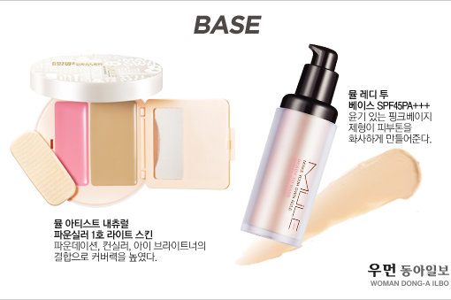BASE 베이스는 최대한 얇고 가볍게 연출한다. 피부톤을 보정하는 핑크 펄 베이스를 피부에 얇게 바른 후, 파운데이션과 컨실러를 믹스해 결점 없는 깨끗한 피부를 연출한다. 아이 브라이트너로 눈 밑 다크써클과 입가의 팔자주름을 커버한다.