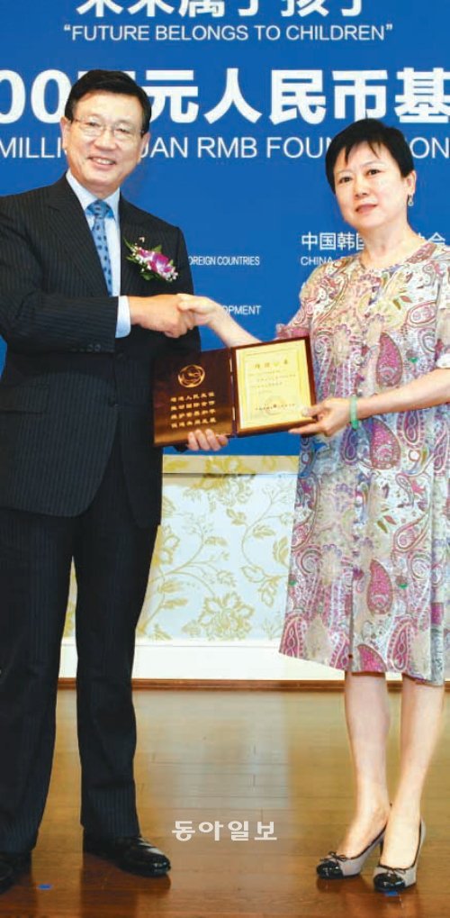 박삼구 금호아시아나그룹 회장(왼쪽)과 리샤오린 중국인민대외우호협회장이 4일 베이징에서 열린 ‘미래는 어린이 세상’기금 기부 조인식에 참석했다. 금호타이어는 총 300만 위안(약 5억4000만 원)을 기부했다.