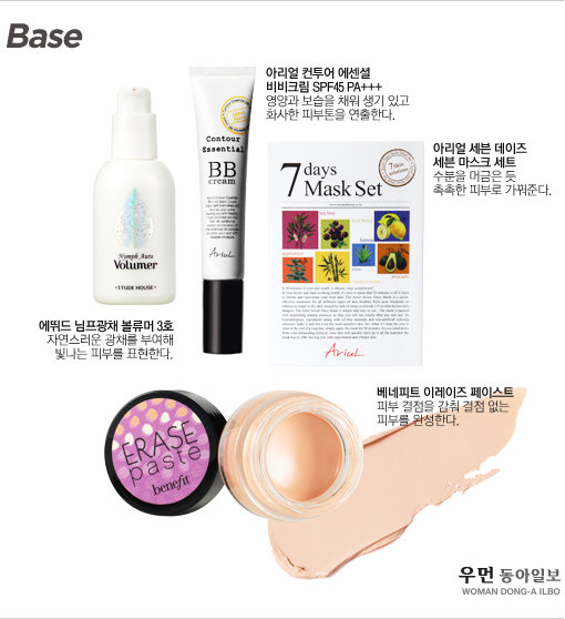 비비 크림을 얼굴 안쪽 위주로 펴 바르고, 외곽으로 갈수록 양이 적어지게 한다. 잡티가 거의 없기 때문에 컨실러는 생략하지만, 다크써클 부위는 아이 컨실러를 사용해 화사하게 밝혀준다.