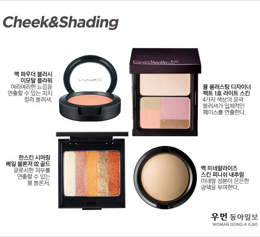 CHEEK & SHADING 살구톤 블려셔로 광대뼈를 감싸듯 얹어주고 자연스럽게 얼굴 외곽 쪽으로 섀딩한다. 시머링한 느낌의 하이라이터로 T존을 가볍게 쓸어준다. 어두운 피부톤은 눈 아래 삼각존에 하이라이터를 주면 들떠 보이기 때문에 생략한다.