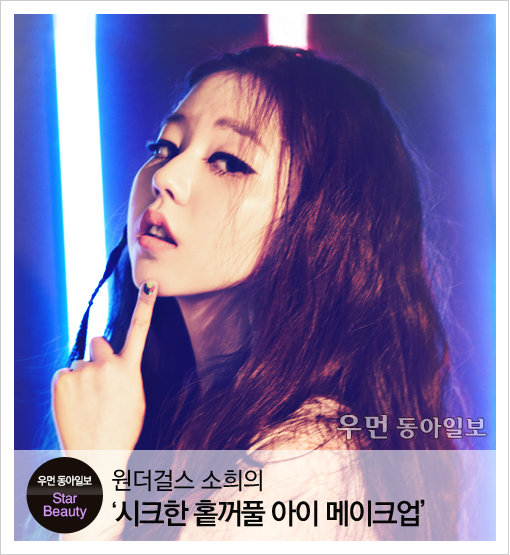 홑꺼풀 눈의 매력을 한껏 살린 원더걸스 소희의 아이 메이크업이 눈길을 끈다. 아이 라인을 도톰하게 그려준 뒤 눈꼬리에서 수평으로 길게 빼내 그려 깔끔하게 마무리. 여기에 선명한 다홍빛 립으로 포인트를 줬다. 시크하면서도 발랄한 느낌을 살린 그녀의 메이크업 노하우를 메이크업 아티스트 최신호씨에게 들었다.