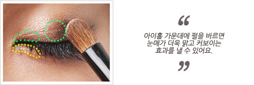 펄 카키 섀도를 쌍꺼풀 라인에서 살짝 올라오는 면적만큼 포인트 섀도로 발라준다. 언더라인도 윗 라인과 함께 연결되는 느낌으로 중간에서 눈꼬리까지 발라준다.