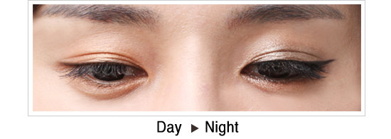 “카페나 레스토랑의 어둡고 노란 조명 아래에서는 블링블링한 펄 섀도가 진가를 발휘하죠. 조명이 빛나는 각도에 따라 미세한 펄이 반짝이는 느낌을 더해주거든요. 여기에 강렬한 눈매를 완성하는 ‘더블 아이라인’을 시도해보세요. 낮에 그렸던 윗 라인의 눈꼬리를 위로 길게 빼고 언더라인을 겹치지 않게 그려주면 완성할 수 있어요.”
