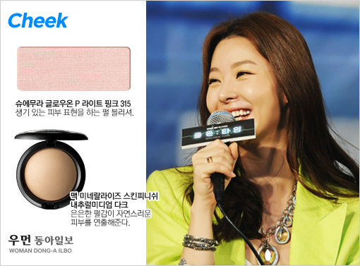 눈썹을 그릴 때는 헤어컬러와 맞는 아이브로 마스카라를 활용해 눈썹 결을 자연스럽게 살려준 뒤 아이브로 섀도와 펜슬로 빈곳을 채워주는 것이 자연스럽다. CHEEK 동그란 얼굴형은 메이크업을 할 때 블러셔를 광대부분에서 사선으로 터치하며 살짝 감싸듯이 발라준다. 또한 페이스라인과 턱선을 셰딩하면 훨씬 갸름해 보이는 효과가 있다.