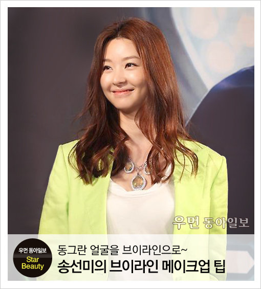 동그란 얼굴은 귀엽고 사랑스러운 이미지를 연출하지만 여성스러운 매력이 덜하다는 것이 단점. 메이크업만으로 동그란 얼굴형의 단점을 완벽 커버하는 방법을 메이크업 아티스트 정선미씨(라엔뜨레 원장)에게 배워보자. EYE 동그란 얼굴을 가진 송선미씨의 경우 일자 눈썹 모양보다는 살짝 아치모양이 되도록 그려준다. 일자눈썹보다 훨씬 갸름한 얼굴형을 만들 수 있기 때문이다.