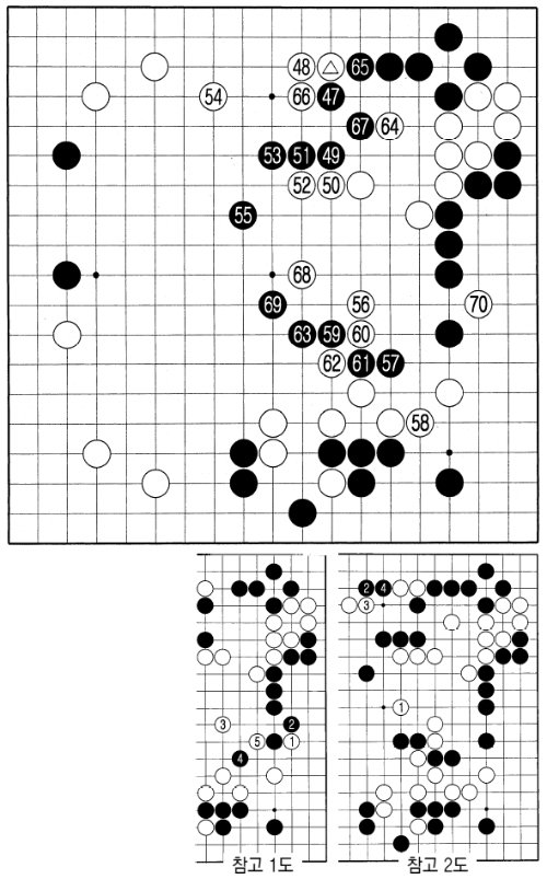 백이 전보에서 △로 압박해 온 데 대해 흑이 47로 백을 가르고 중앙으로 진출한 것은 당연하다. 백은 이 압박으로 54까지 상변에서 실리를 벌어들인다. 55는 빛나는 대세점. 반상 전체를 호령하는 수. 우상귀에서 뻗어 나온 백 대마를 위협하는 한편 좌변의 흑 2점에도 힘을 실어주는 수. 백이 둔 것과 비교하면 그 크기를 알 수 있다.