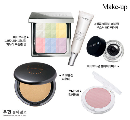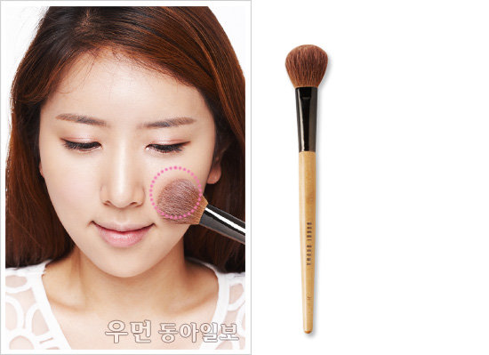 “뼈가 솟은 부위는 섀딩으로 축소시키고, 움푹 꺼진 부위는 하이라이터로 볼륨감을 주세요. 옆 광대의 면적을 축소하고 앞부분에 볼륨감을 주기 위해 볼터치도 옆부분이나 사선 형태보다는 볼 앞부분에 둥글리듯 바르는 것이 좋아요. 아이라인은 본래의 눈길이보다 길게 그려주는 것이 광대뼈에 묻힌 이목구비를 돋보이게 할 수 있어요.” SOLUTION 1 ☞ 튀어나온 광대뼈는 섀딩으로 다운시키기