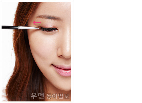 앞 부분을 입체적으로 연출하기 위해 볼터치는 얼굴 앞 부분을 위주로 발라주세요. 시선이 앞으로 고정되어 상대적으로 광대뼈가 작아보입니다. SOLUTION 5 ☞ 아이라인은 가로 방향으로 길게!