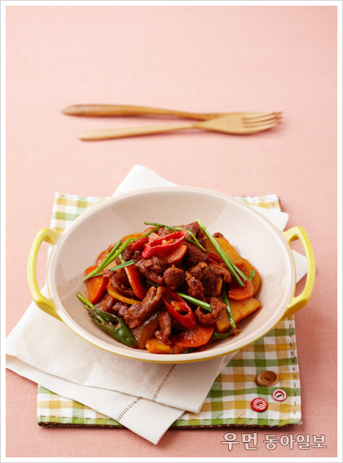 만드는 법 1. 볼에 오리고기를 넣고 양파, 생간을 강판에 갈아 넣은 후 맛술로 밑간한다. 2. 1에 양념장을 반만 넣고 잘 버무린다. 3. 양파는 굵게 채 썰고 부추는 5cm 길이로 썰어 준비한다. 당근, 감자는 한입 크기로 썰고 대파와 청고추, 홍고추는 어슷 썬다. 4. TNS팬에 기름을 두르고 1을 넣고 남은 양념장과 당근, 감자, 양파를 함께 넣고 볶다가 고기가 어느 정도 익으면 대파, 청고추, 홍고추를 넣고 볶는다. 5. 3에 부추를 넣어 완성한다.