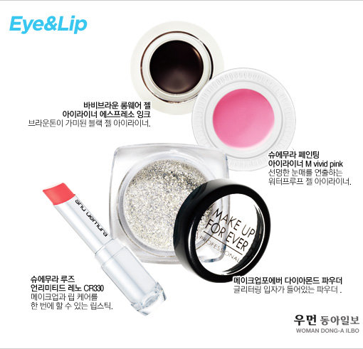 EYE 섀도를 생략하고 눈두덩의 유분기를 파우더로 살짝 제거한 뒤 짙은 브라운 컬러의 젤 아이라이너로 라인을 또렷하게 그려준다. 눈꼬리는 살짝 길게 빼 눈매가 길어 보이는 효과를 준다. 화사함을 살리기 위해 눈두덩과 애교살 부분에 글리터링 파우더를 손가락으로 문질러 발라준다.