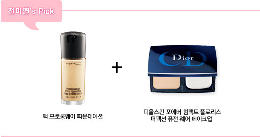 "‘맥 프로롱웨어 파운데이션’을 바르면 필름막이 형성되어 하루 종일 촉촉함이 유지되고, 번들거림 없는 매끈한 도자기 피부가 완성된다. 매끈한 피부 위에 파우더를 얹으면 매트하고 답답해 보이기 쉬우므로 ‘디올 스킨포에버 컴팩트 플로리스 퍼펙션 퓨전 웨어 메이크업’을 얹어준다. 파우더 안에 에센스를 넣은 수분 파우더로 적당히 부드럽고 촉촉한 느낌을 선사한다.”