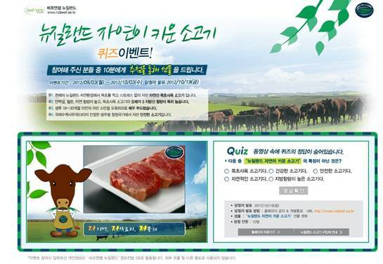 이번 온라인 퀴즈는 대국민 명절 추석을 맞아 저지방, 저칼로리, 저콜레스테롤의 목초사육 ‘뉴질랜드 자연이 키운 소고기’를 알리고자 마련되었다. 비프앤램 뉴질랜드 홈페이지의 이벤트 페이지에 접속해 뉴질랜드 소고기에 대한 플래시 애니메이션을 보고 퀴즈 정답을 맞추면 응모할 수 있다.