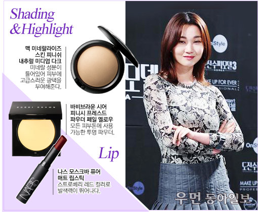 아이브로는 본래의 눈썹을 살리고 눈썹전용펜슬과 섀도를 사용해 그려준다. 이 때 섀도는 소량만 사용하고, 펜슬을 사용할 경우 최대한 솜에서 힘을 빼 뭉침 없게 그려준다. SHADING & HIGHLIGHT 크림 타입 하이라이터로 윤곽을 먼저 잡은 뒤, 팩트 타임 하이라이터로 고정시킨다. 얼굴이 작으면서 둥근형이기 때문에 얼굴 윤곽 광대 위주로 음영을 주어 샤프하게 표현한다. 코 옆선에도 음영을 주면 입체적인 얼굴을 표현할 수 있다.