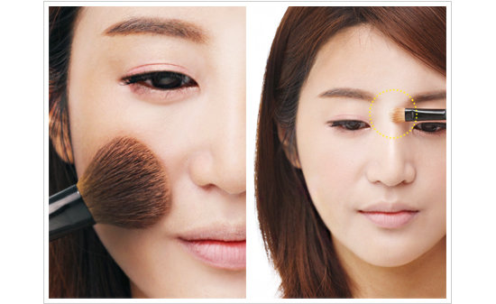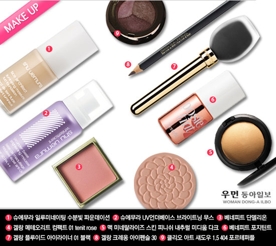 1. 촉촉한 화이트펄 베이스를 T존과 볼을 중심으로 얼굴에 발라 환한 빛을 만든다. 2. 비비크림 소량을 손등에 덜어 스펀지로 톡톡 두드려준다. 3. 파우더로 유분기를 제거한다. EYE 섀도는 볼터치와 입술 컬러에 맞춰 핑크나, 피치톤의 펄 섀도를 선택한다. 화사함을 부여하는 것이 포인트!