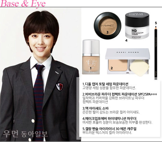 밝지 않은 중간톤의 파운데이션과 비비크림을 1:1 비율로 섞어 라텍스 스펀지로 톡톡 두드려주듯 발라준다. 인위적인 느낌보다는 피부톤을 균일하게 정리하는 용도로 사용한다. 수분감이 있는 투명 파우더를 얼굴 안쪽에 발라 가볍게 마무리한다.