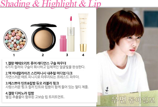 섀딩 파우더와 파우더 팩트를 믹스해 브러시로 귀 앞부분과 볼 앞부분을 가볍게 터치해준다. 하이라이터는 펄감이 없고 컬러가 자연스러운 제품을 T존에만 살짝 발라 마무리한다.