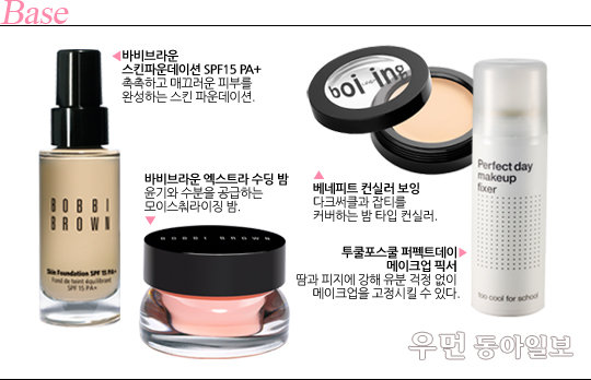화이트 펄 베이스를 얼굴 전체에 얇게 펴 바르고, 파운데이션과 수딩밤을 1:1 비율로 믹스해 발라준다. 옐로톤 컨실러를 이용해 다크써클과 잡티를 꼼꼼히 가려주면 얇고 깨끗한 베이스가 탄생한다.