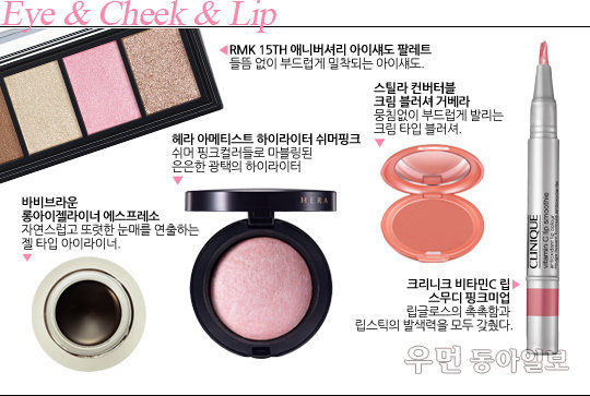 은은한 핑크빛이 감도는 블러셔를 섀도 대용으로 쌍꺼풀 라인 윗부분까지 그라데이션해서 발라준다. 젤 타입의 컬러 라이너로 점막을 꼼꼼하게 메우고, 속눈썹이 난 1mm 윗부분까지 라인을 그려 또렷한 눈매를 강조한다.