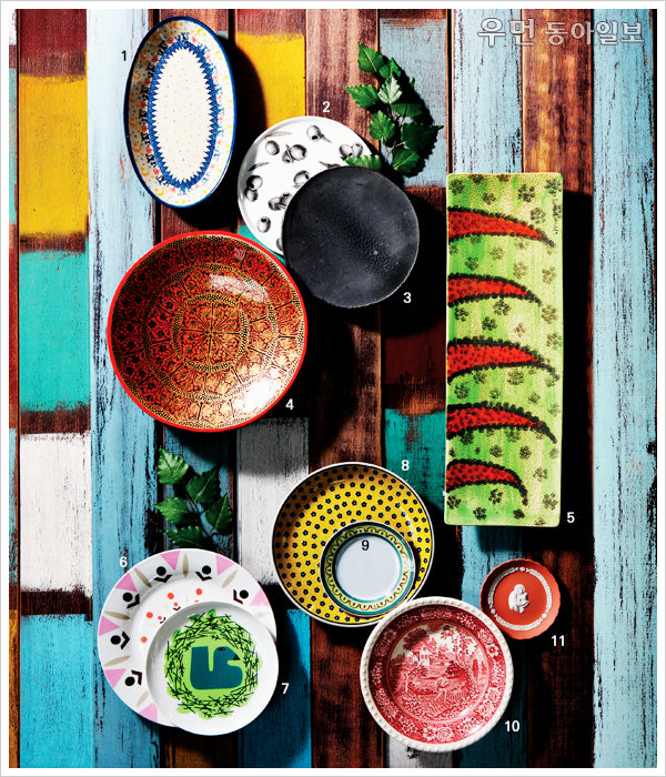 1 에스닉 패턴이 눈에 띄는 폴란드 타원형 접시. 29.5×18cm 6만7천원 리넥. 2 펜으로 스케치한 올리브 일러스트가 인상적이다. 지름 22cm 가격미정 한국도자기. 3 도예가 정영의 블랙 컬러 접시는 모던한 인테리어의 벽 장식으로 안성맞춤. 지름 22cm 3만원 차마시는그릇가게오름. 4 골드 패턴이 이국적인 느낌을 자아내는 목기 접기. 지름 30cm 1만5천원 헨리디자인. 5 빈티지 느낌의 그림이 그려진 직사각 접시는 도예가 정영의 작품. 18×54cm 15만원 차마시는그릇가게오름. 6 캐주얼한 분위기의 일러스트 접시는 아이 방을 장식할 때 딱. 지름 27cm 7만6천원 에이치픽스. 7 둥지에 새가 앉아 있는 일러스트가 앙증맞다. 지름 20cm 5만9천원 에이치픽스. 8 톤 다운된 옐로와 블루 컬러가 빈티지한 느낌을 더하는 세라믹 접시. 지름 25.5cm 5만2천원 리넥. 9 클래식하면서 에스닉한 느낌이 나는 접시. 지름 14cm 4개 세트 13만8천원 키스마이하우스. 10 목가적 풍경이 그려진 빌레로이앤보흐의 빈티지 접시는 클래식한 공간에 잘 어울린다. 지름 22cm 가격미정 차마시는그릇가게오름. 11 클래식한 부조 장식이 돋보이는 접시는 앤티크 테이블 위에 장식하면 잘 어울린다. 지름 12.5cm 3만8천원 제인홈.