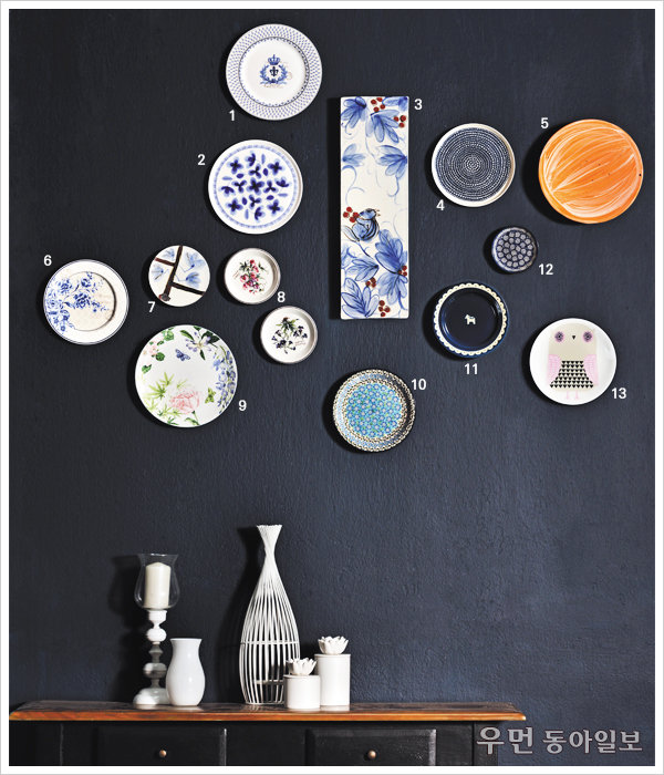 1 클래식 패턴 접시는 같은 톤의 접시들과 매치하면 잘 어울린다. 지름 25cm 2개 세트 3만9천원 라니홈. 2 블루 컬러 플라워가 시원한 느낌을 더한다. 지름 22cm 1만7천원 한국도자기. 3 수묵화 한 점을 그릇에 담은 듯한 직사각형 접시는 도예가 정영의 작품. 17×59cm 25만원 차마시는그릇가게오름. 4 시원한 블루 컬러 접시는 모던한 인테리어에 잘 어울린다. 지름 20cm 3만9천원 마리메꼬. 5 붓 터치가 내추럴한 느낌을 더하는 탠저린 컬러 원형 접시. 지름 28cm 8만원 차마시는그릇가게오름. 6 내추럴한 플라워 그림과 골드 테두리가 고급스러운 분위기를 낸다. 지름 19cm 2개 세트 2만2천원 라니홈. 7 꽃 그림이 그려진 접시는 마치 원형 액자를 보는 듯하다. 지름 15cm 2만원 차마시는그릇가게오름. 8 보태니컬 플라워 그림이 고급스러운 원형 접시는 빌레로이앤보흐의 빈티지 제품. 지름 14cm 가격미정 차마시는그릇가게오름. 9 화사한 꽃이 그려진 접시는 침실이나 주방 벽을 꾸미기에 제격. 지름 28cm 가격미정 한국도자기. 10 잔잔한 꽃무늬 접시는 공간에 로맨틱한 분위기를 더한다. 지름 21cm 3만2천원 리넥. 11 스칸디나비아 느낌의 앤티크 플레이트. 지름 16.5cm 1만4천5백원 로즈베리. 12 에스닉 패턴이 공간에 이국적인 느낌을 더한다. 지름 10cm 7천원 리넥. 13 부엉이 일러스트가 그려진 접시는 모던한 공간에 매치하면 good. 지름 20cm 5만9천원 에이치픽스..